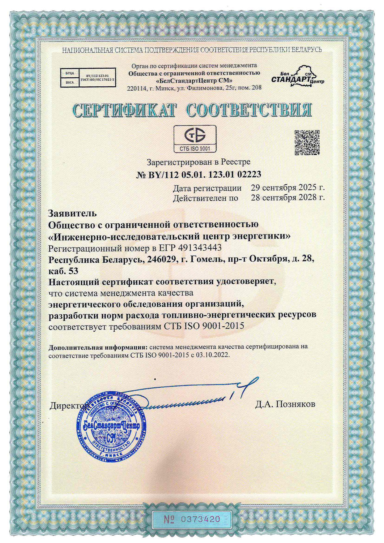 Компания ООО «Инженерно-исследовательский центр энергетики» подтвердила свою компетентность на право оказания услуг по энергетическому обследованию организаций в соответствии с требованиями СТБ 1691-2006. Мы также подтвердили соответствие системе менеджмента качества стандарта – СТБ ISO 9001-2015 «Системы менеджмента качества. Требования».